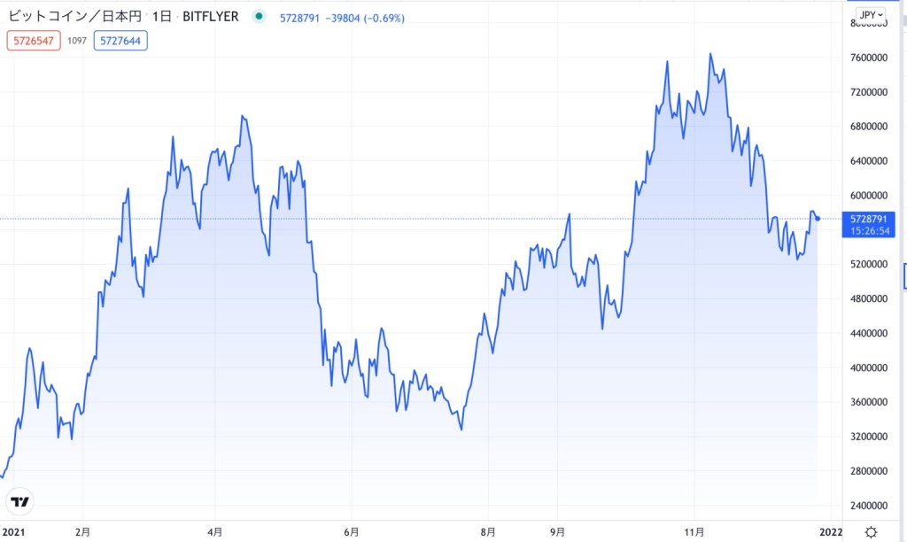 ビットコインをはじめとする仮想通貨(暗号通貨)は2021年5月頃から大きく下落していましたが、その後一度高騰・暴落を起こし、12月現在はまさに高価格帯を推移しています。